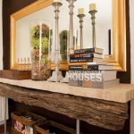 Esszimmer mit Kamin und langem Esstisch.