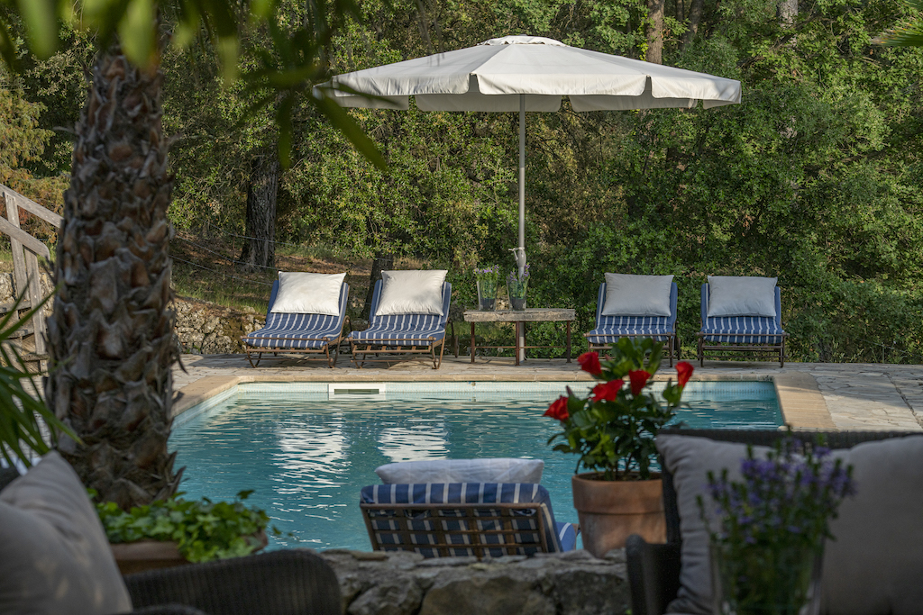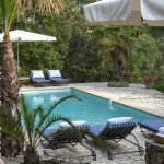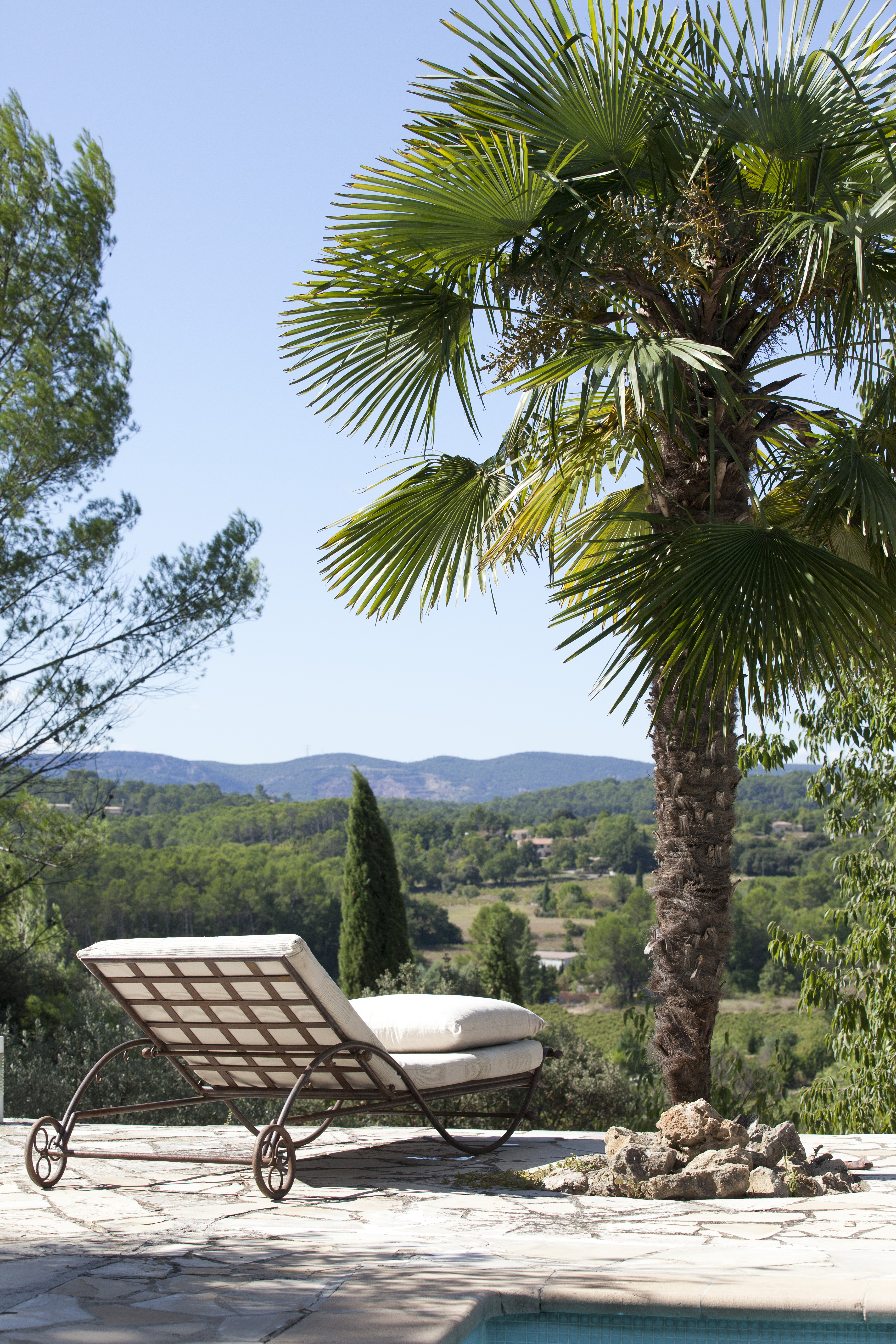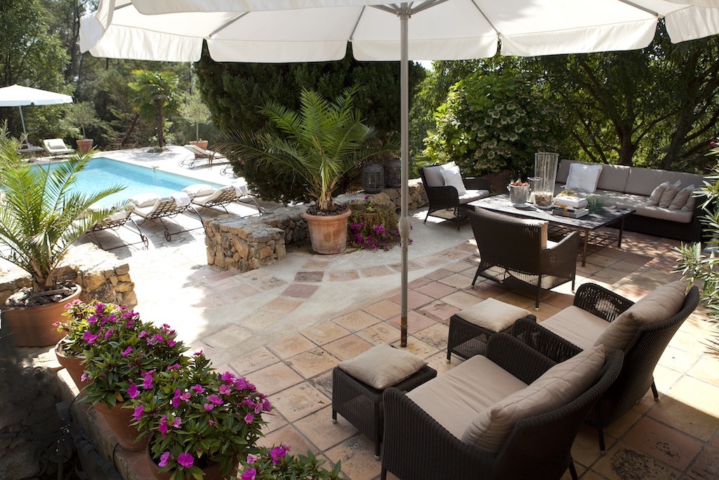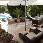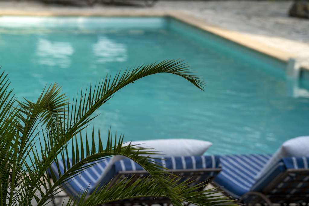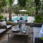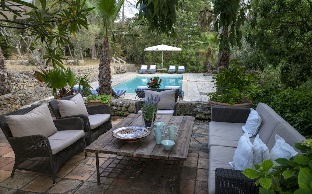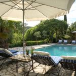 Ved poolen er der 8 solvogne og små borde. Derudover er der, i skyggen af det store træ, et lounge med sofa og loungestole.