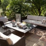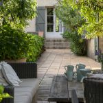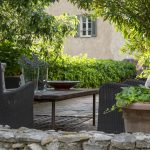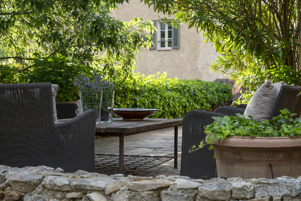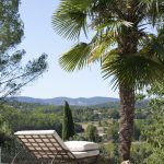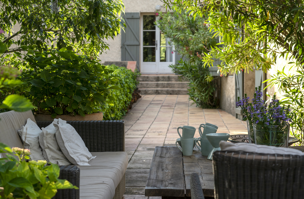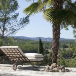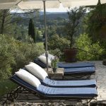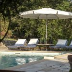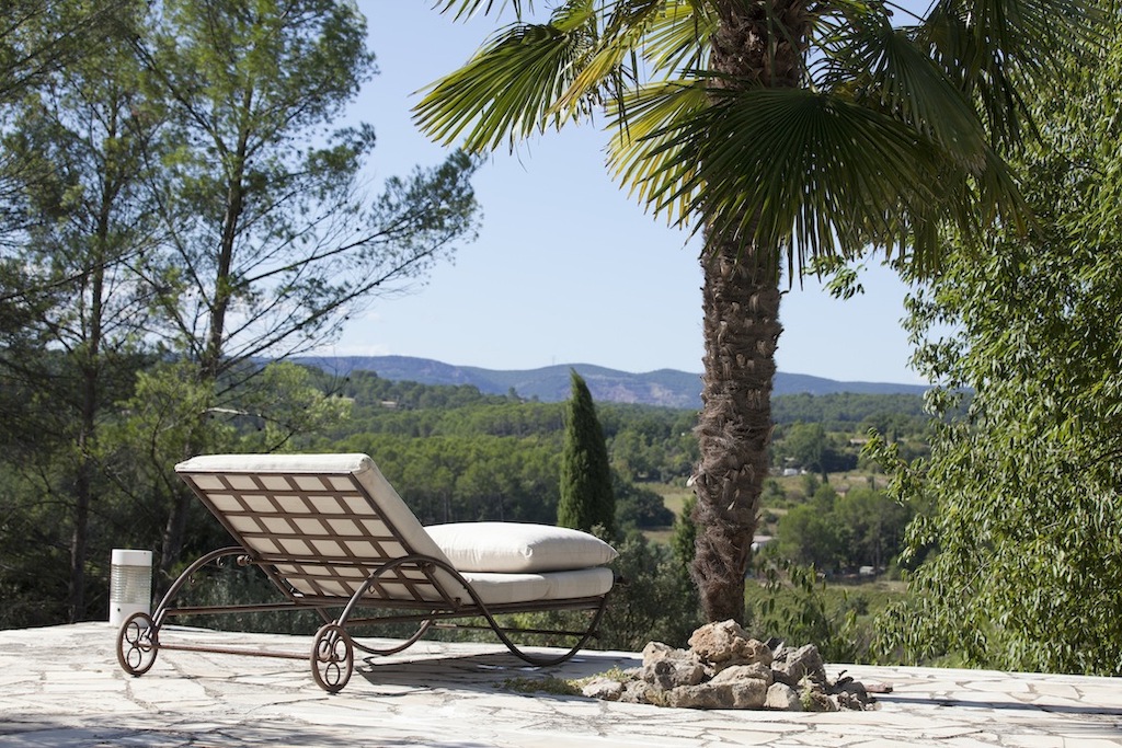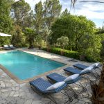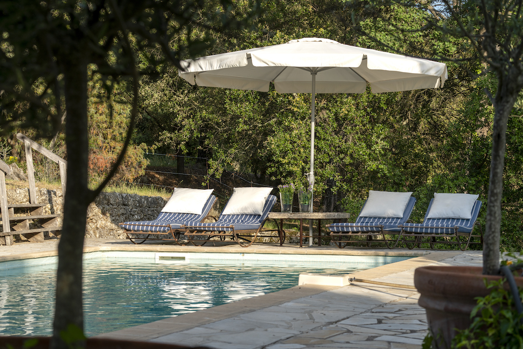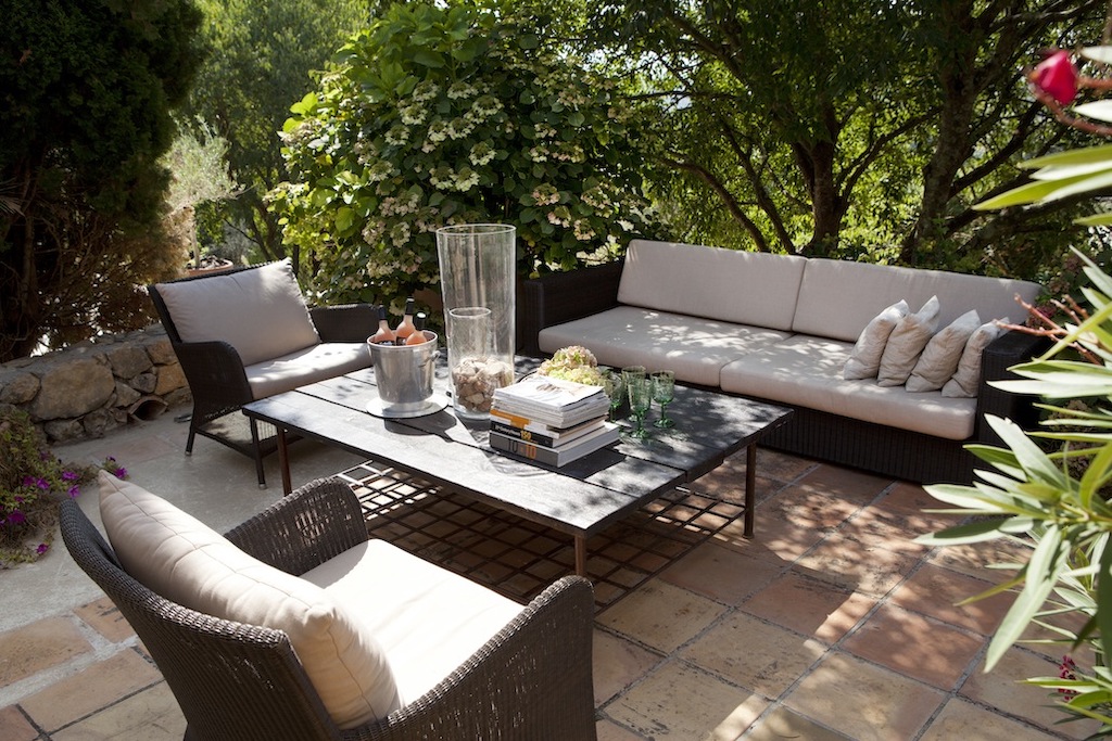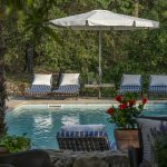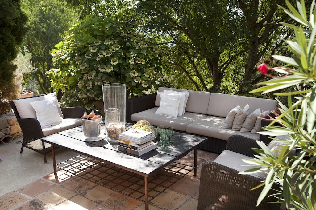 Ved poolen er der 8 solvogne og små borde. Derudover er der, i skyggen af det store træ, et lounge med sofa og loungestole.